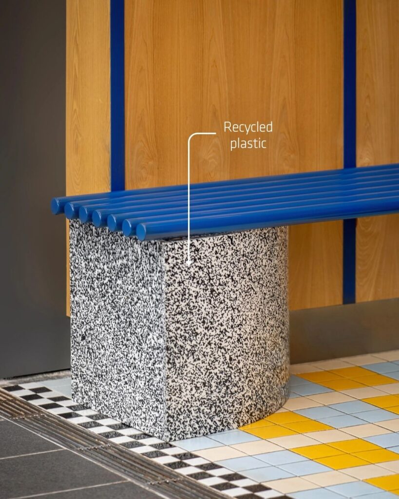 The black and white, confetti-like furniture produced using recycled plastic by Precious Plastic Malaysia upcycles waste into purposeful design and introduces a contemporary grunge character to the snack stand.