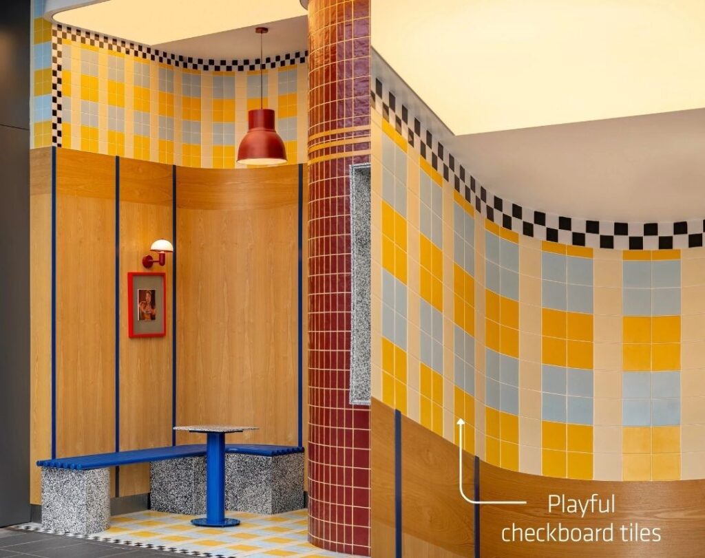 Bold, saturated colours set the mood, enhanced by playful checkboard tiles and softened with honey-toned wood, while cheeky touches like “the best churros in town” add warmth and humour to the space.