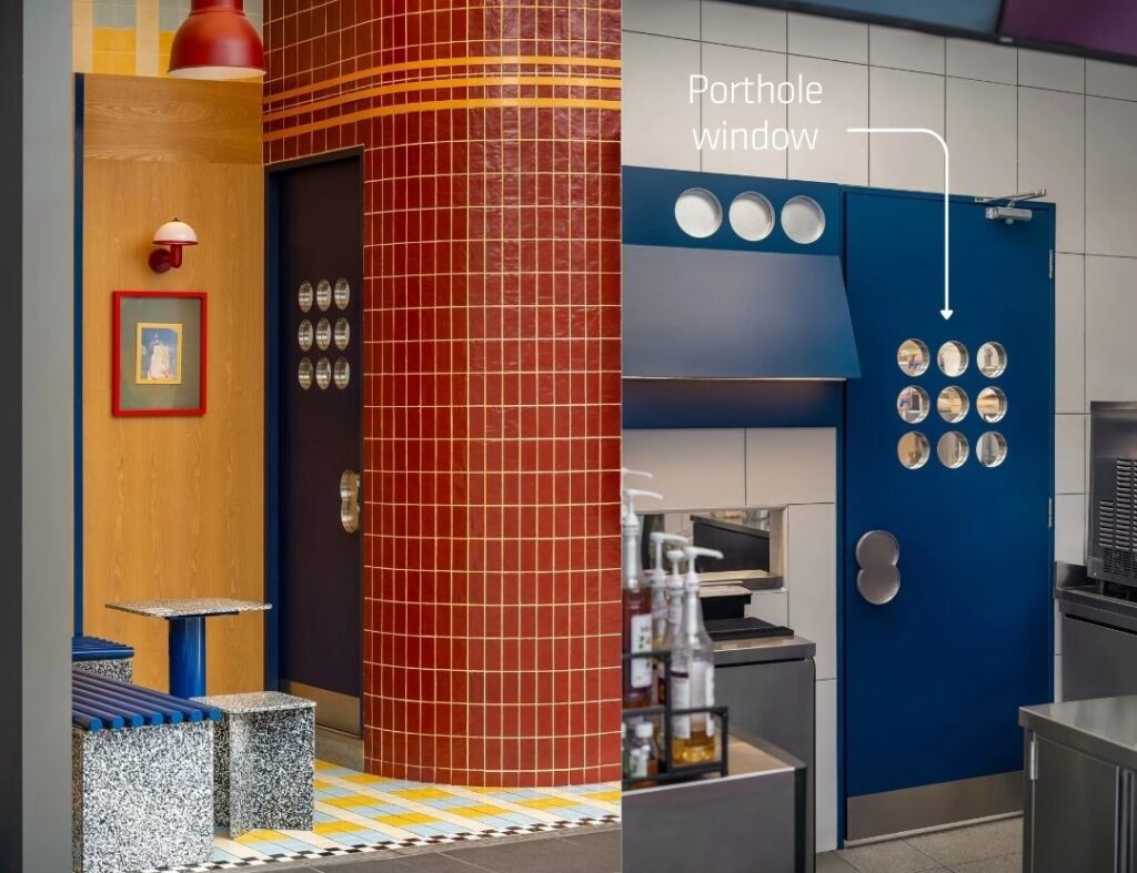 Staying true to the 70s inspired concept, the designer introduced porthole windows on the kitchen door, a thoughtful nod to retro design that strengthens the visual narrative.