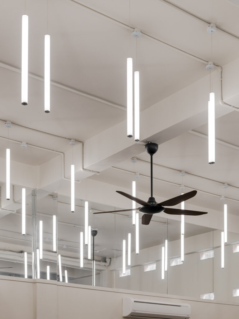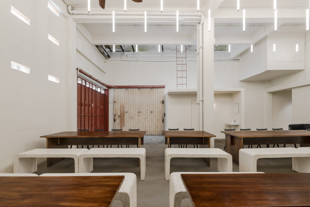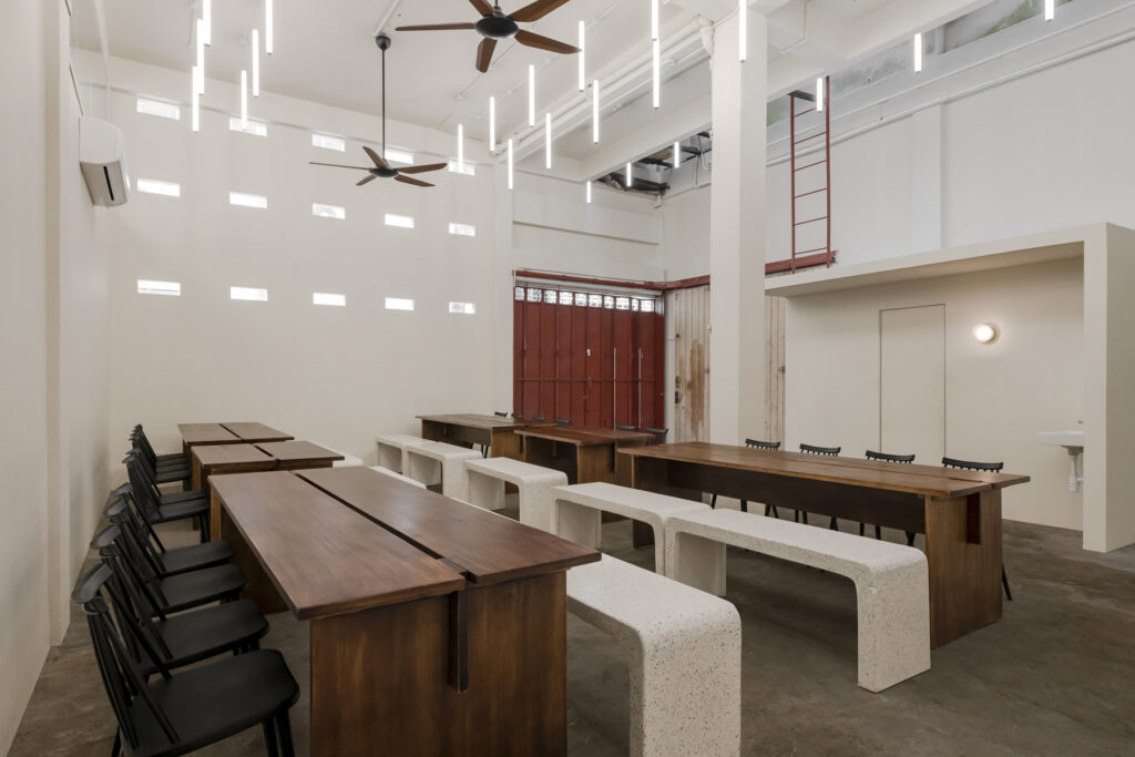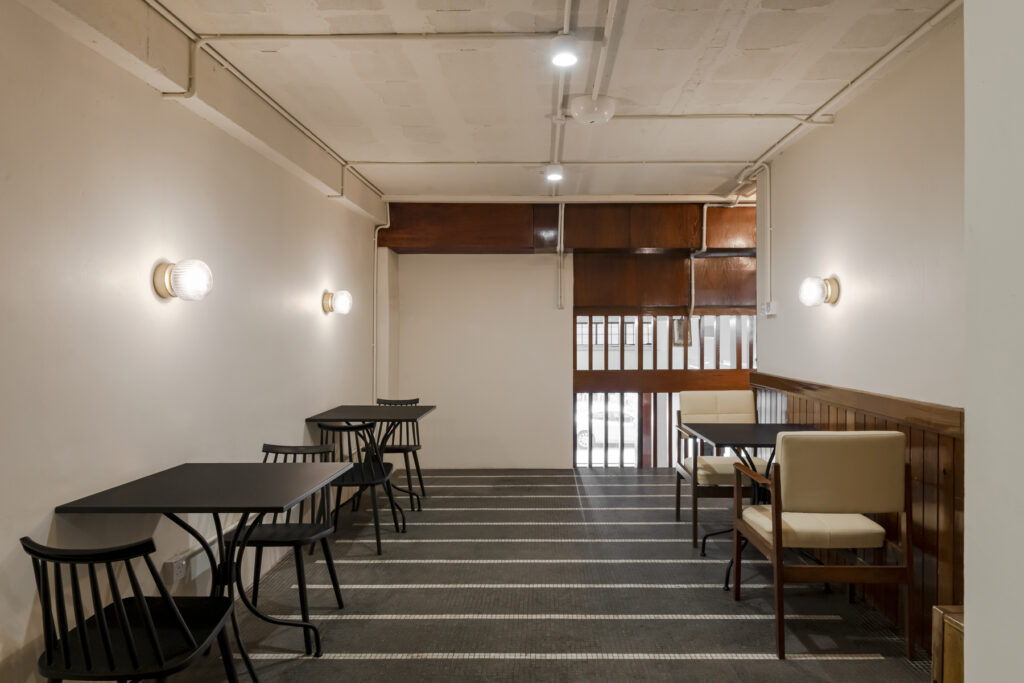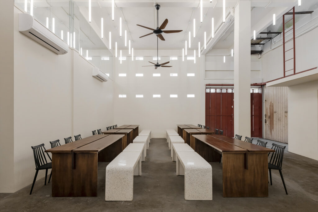 Instead of demolishing this piece of history, she chose to celebrate it. The original Hock Bee Bros. signage has been preserved, acting as a memory capsule for Kuantan. The protruding geometric prism windows, one of the building’s key features, were retained for their sculptural form, which defines its character while providing natural light and ventilation into the building.