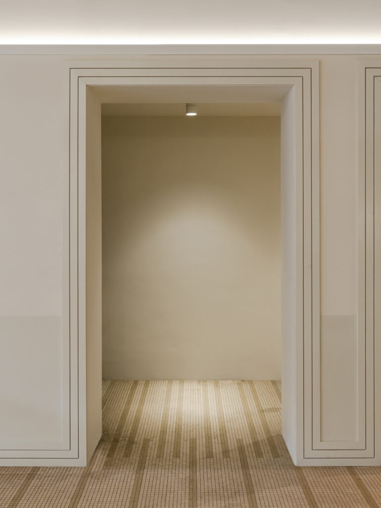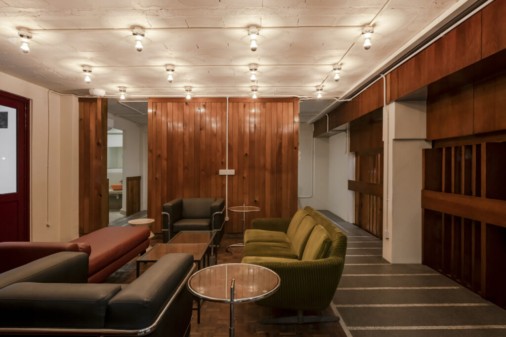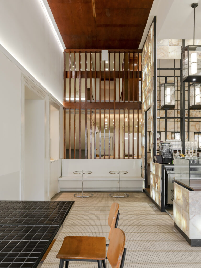 In dialogue with the past, the reception coffee bar repurposes the onyx tiles to reflect the building’s original material palette, while a back-lit effect adds a modern touch. Together with the existing wooden display cabinet and double-height wood louvers, it creates a strong visual anchor at the entrance.