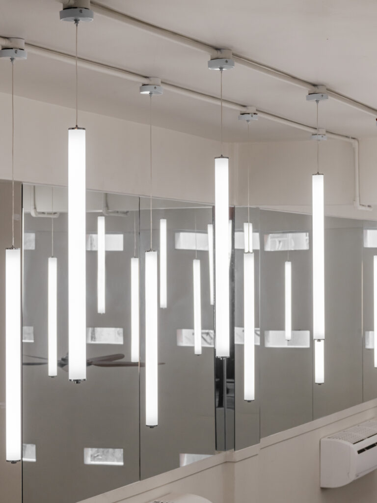 Above the coffee bar, custom pendant lights draw inspiration from the prism windows and antique gas streetlamps, bringing a nostalgic yet modern glow to the space.